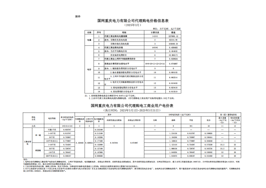 重庆市3月份代理购电工商业用户电价表