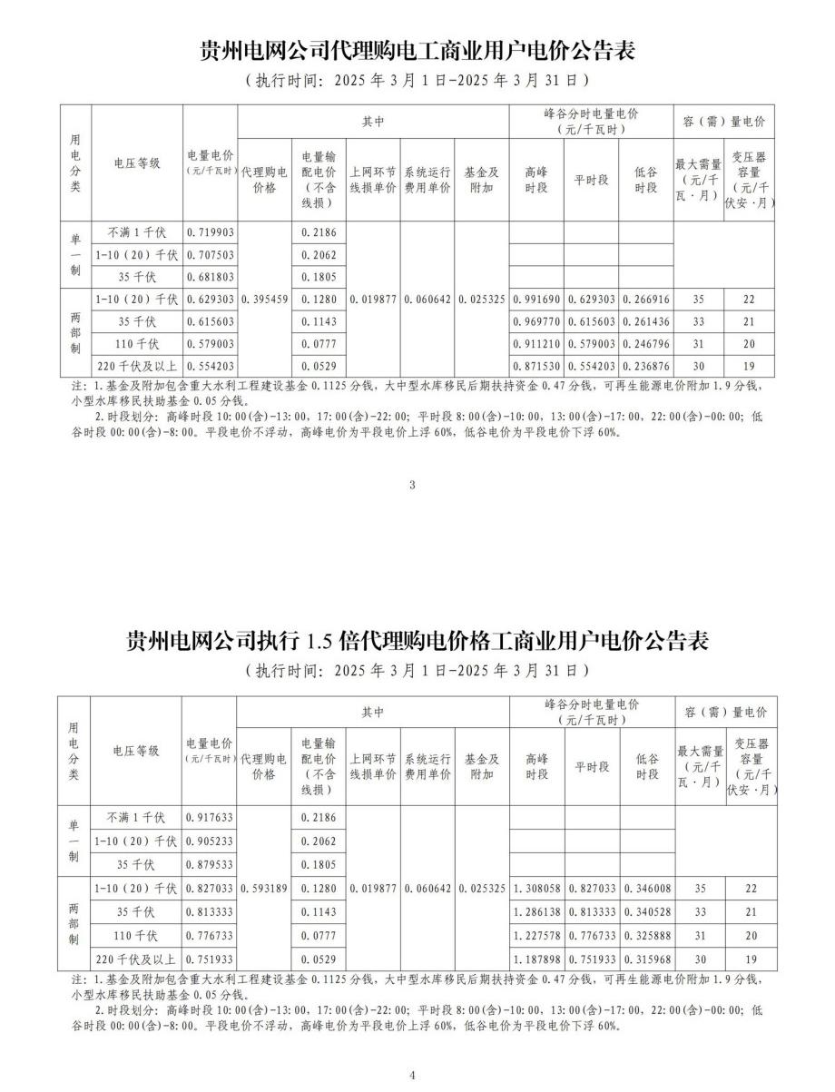 贵州省3月份代理购电工商业用户电价表