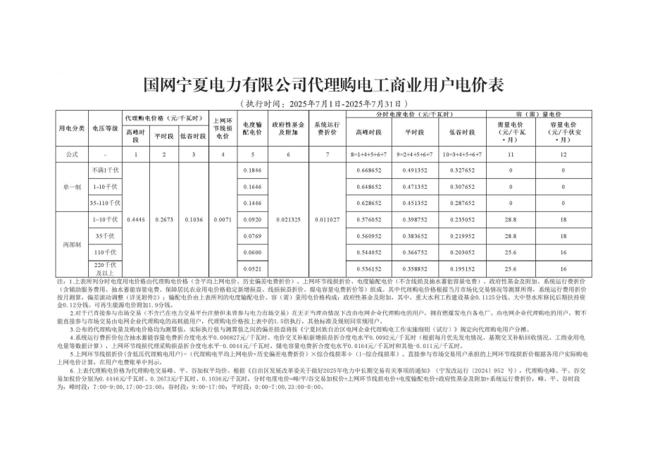 宁夏7月份代理购电工商业用户电价表