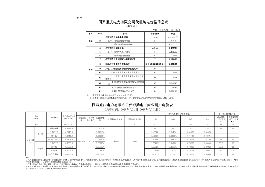 重庆市7月份代理购电工商业用户电价表