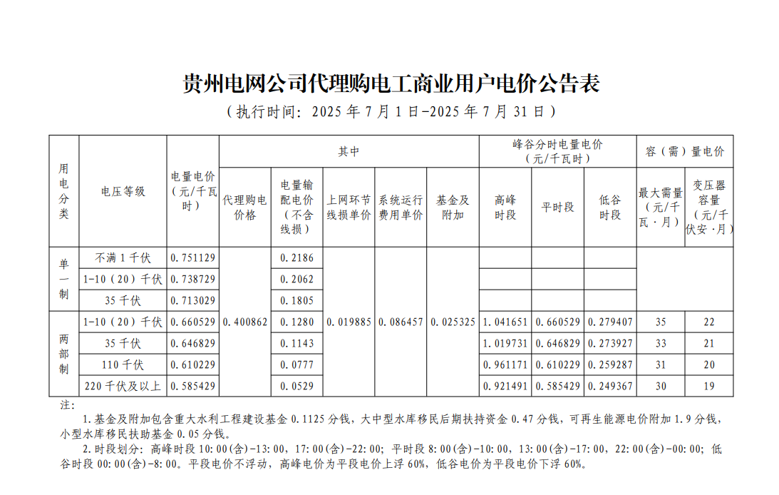 贵州省7月份代理购电工商业用户电价表